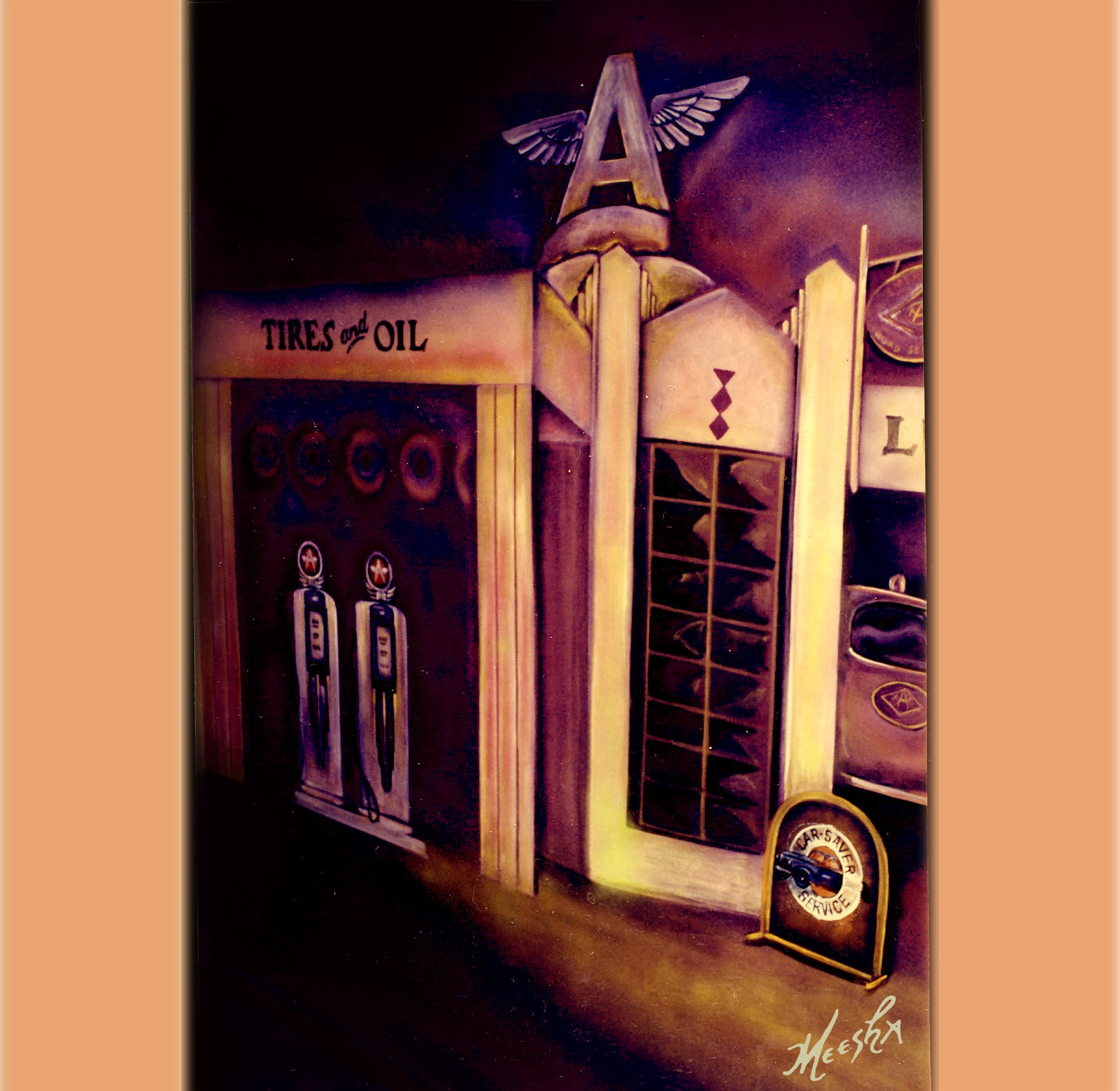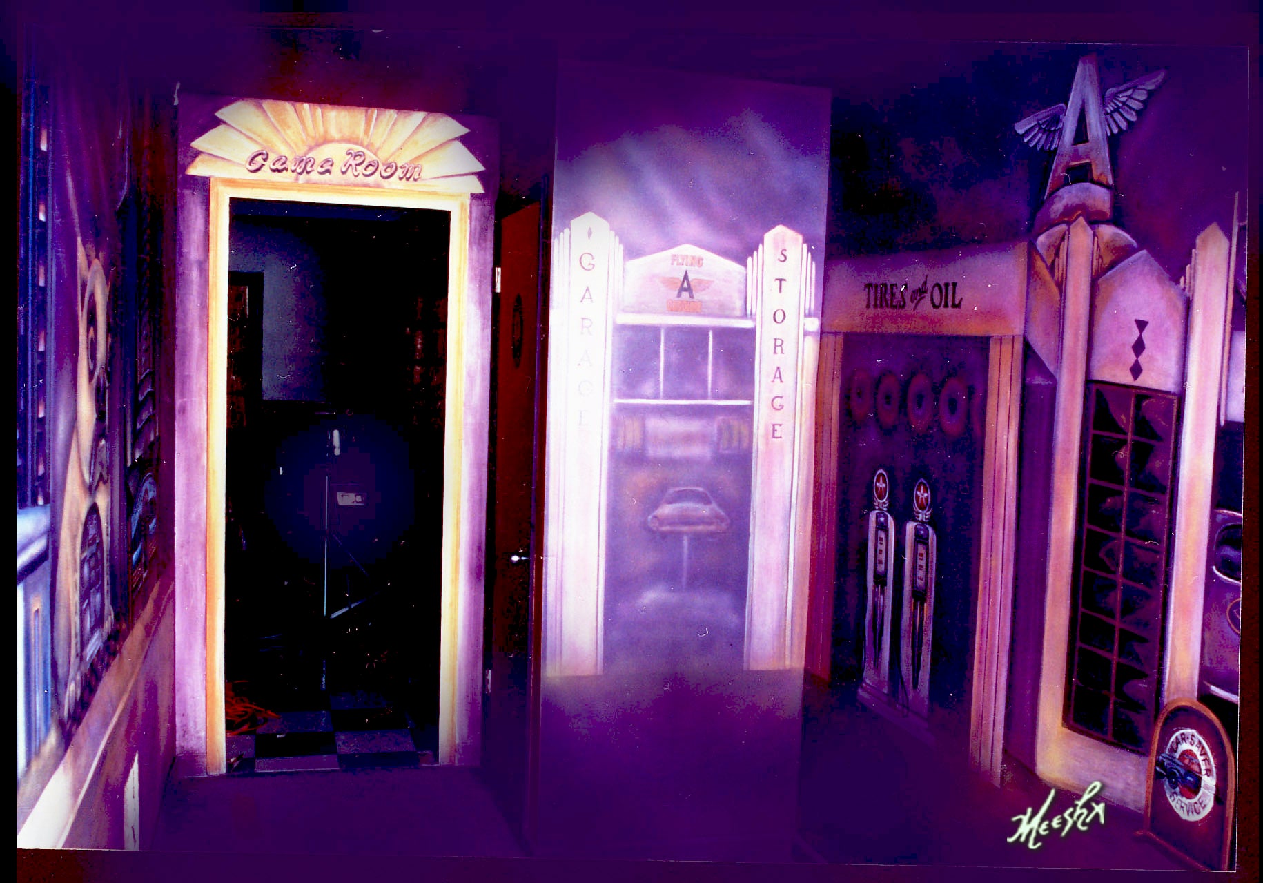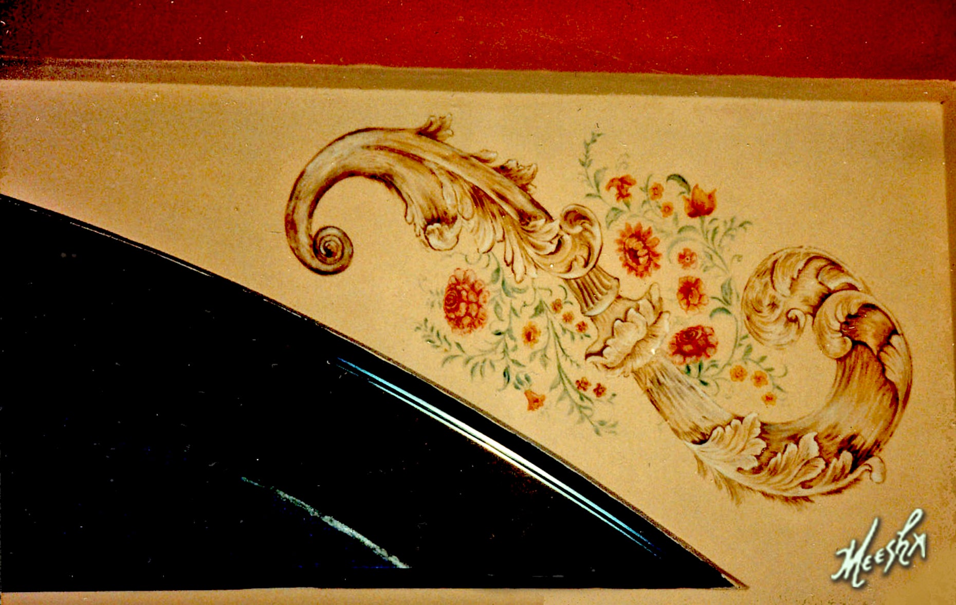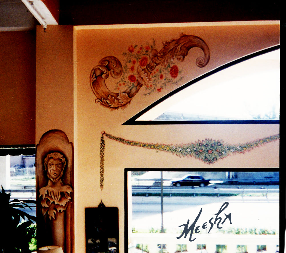 Close-up of gallery wall mural in antique store with scrollwork