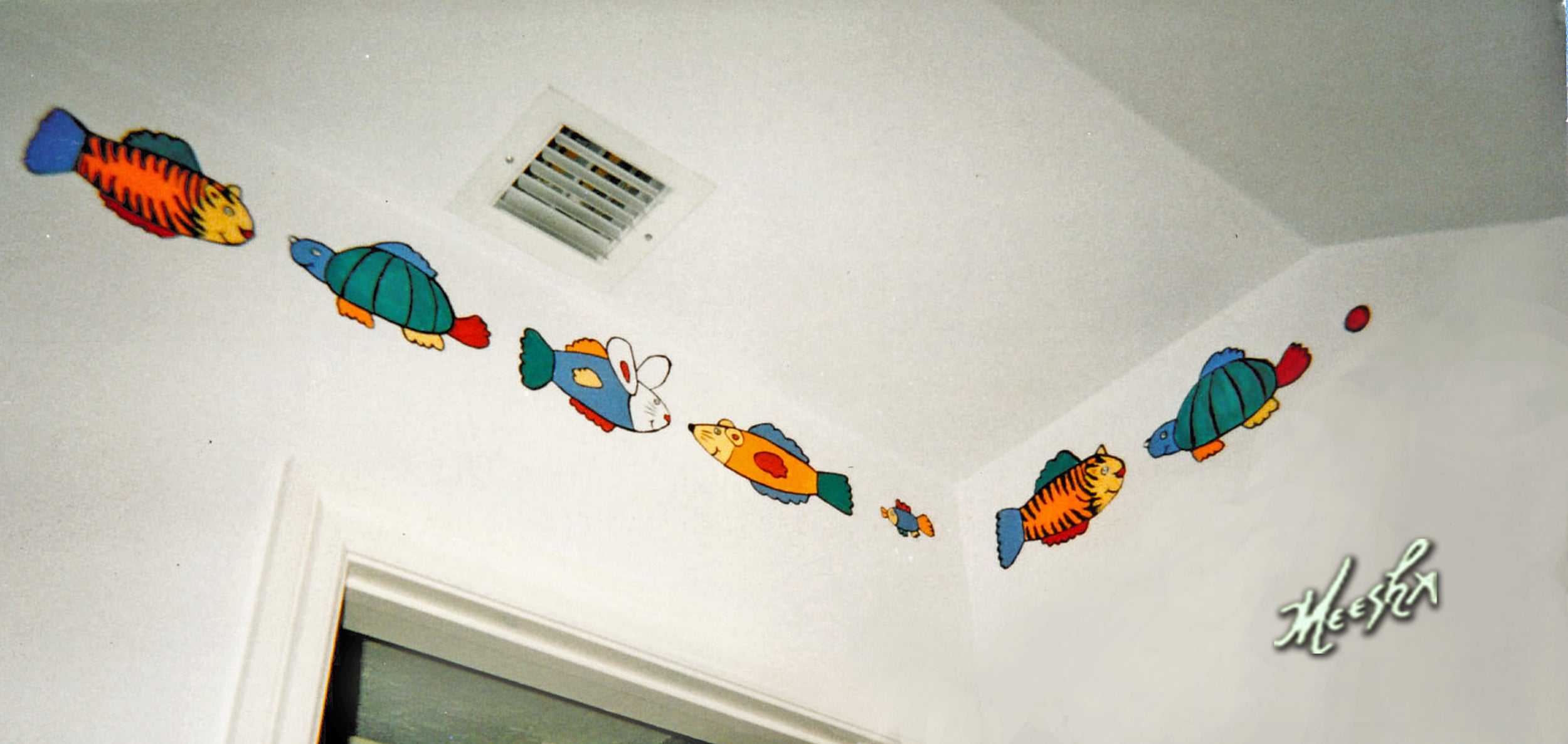 Funny fish border mural in children’s bathroom