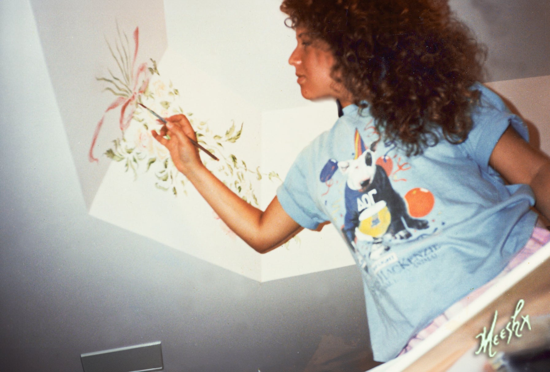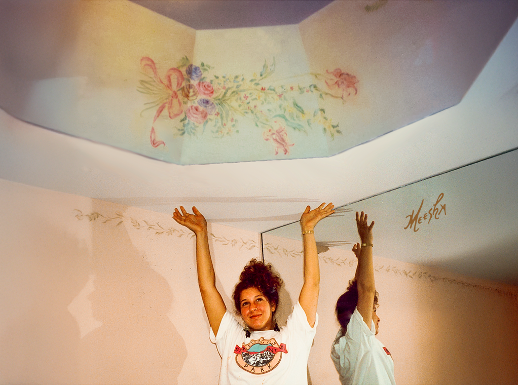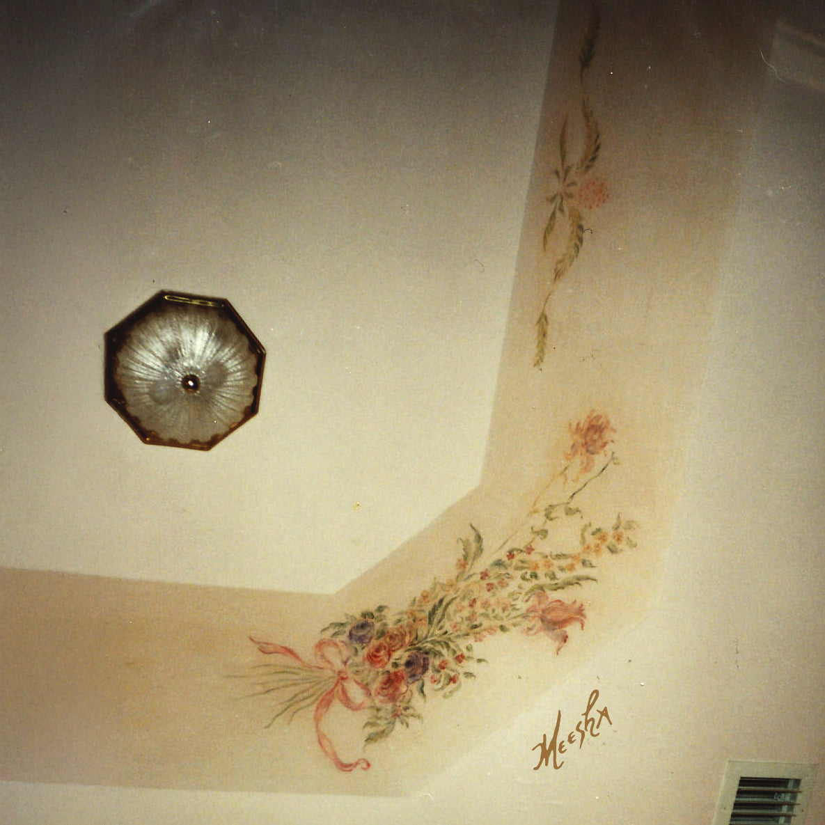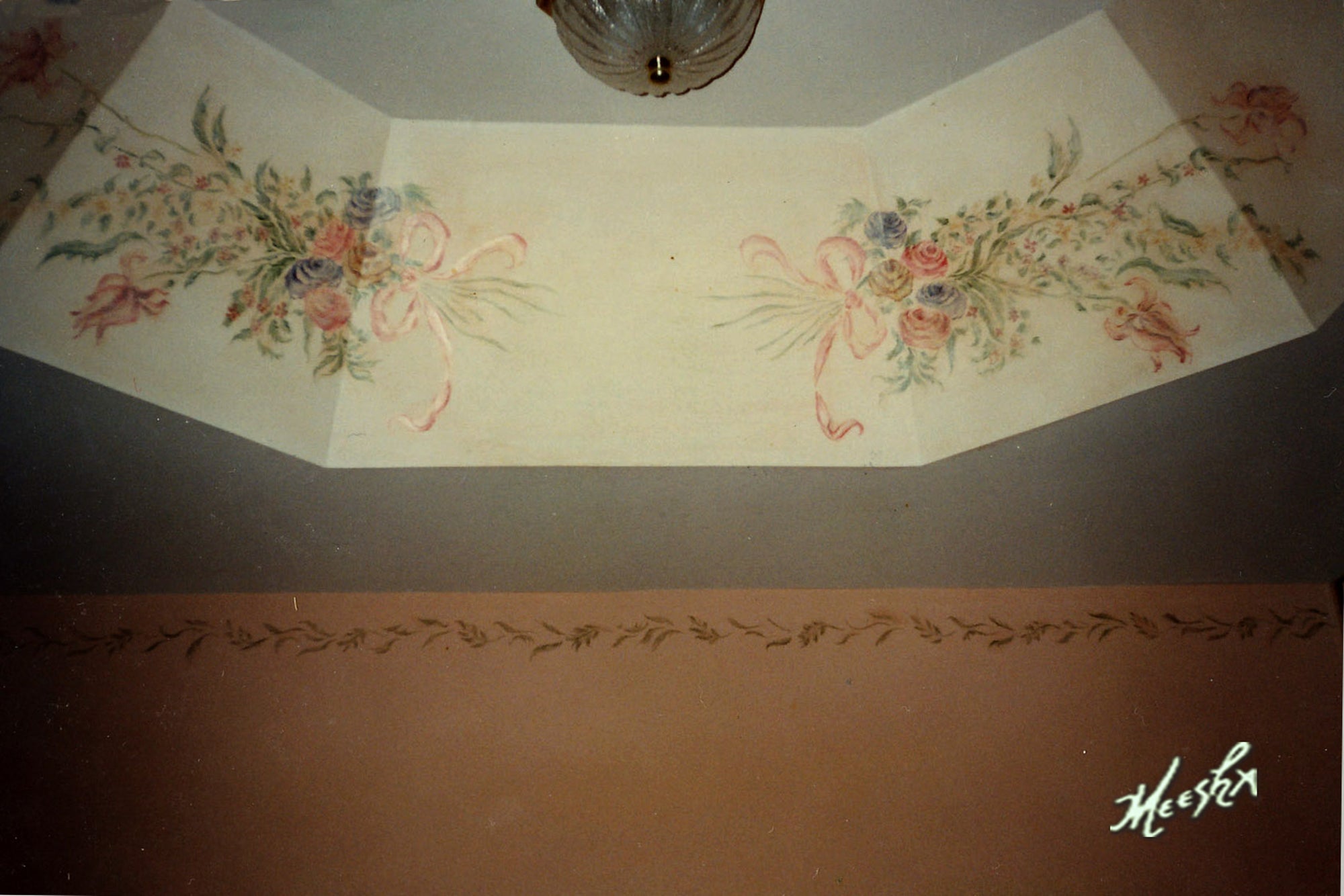 Meesha painting elegant floral mural on bathroom tray ceiling