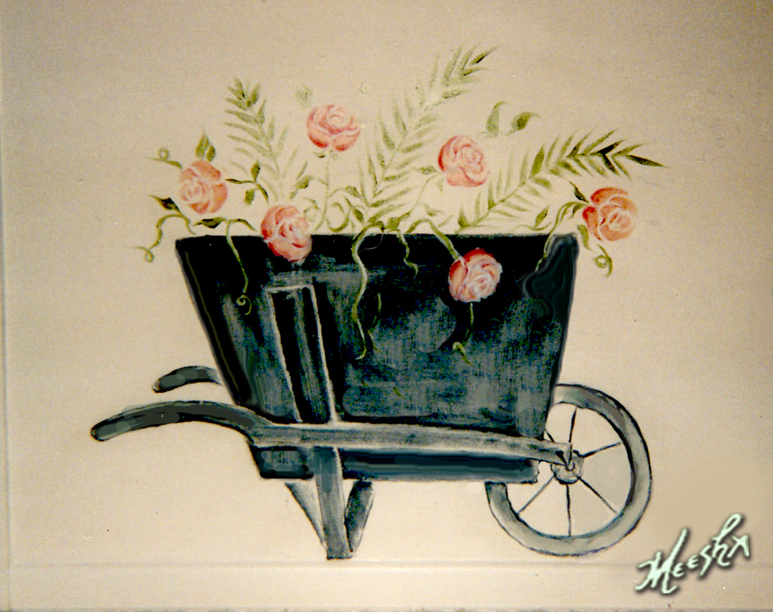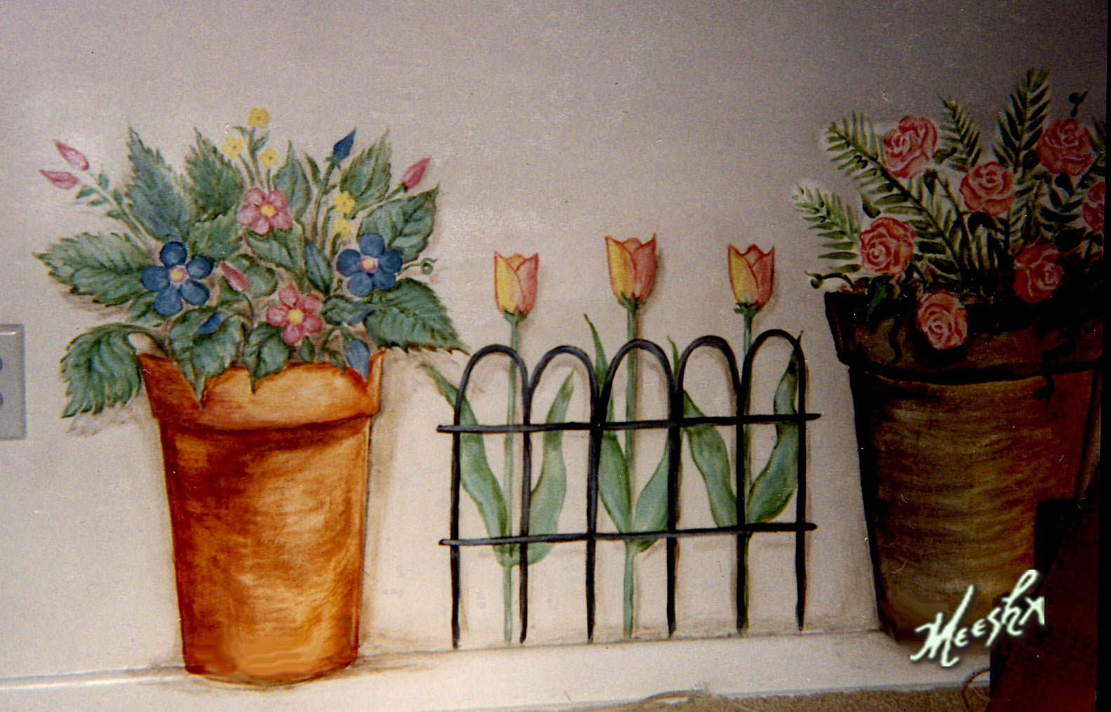Floral wheelbarrel mural in children’s room