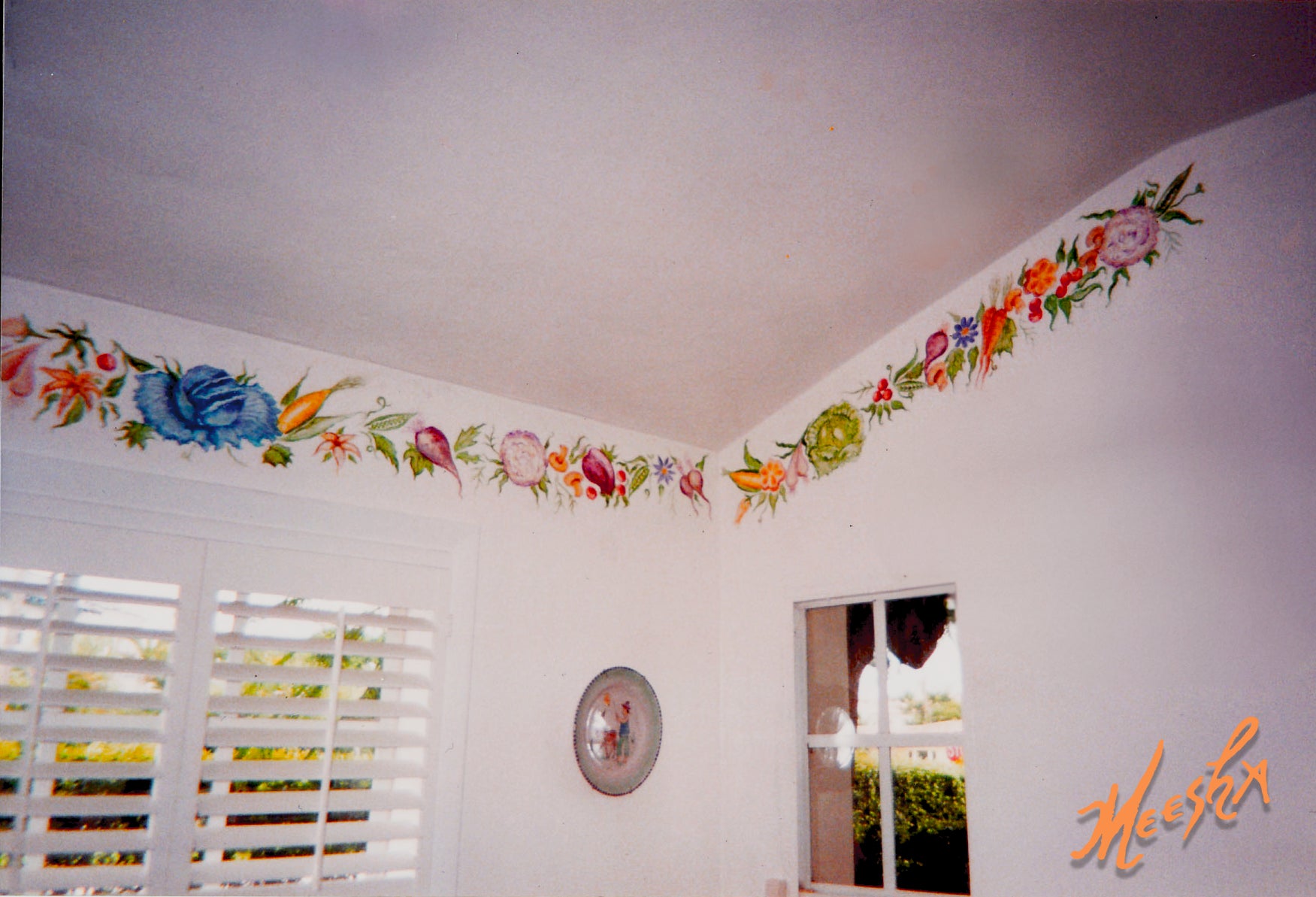 Colorful veggie mural border around kitchen ceiling