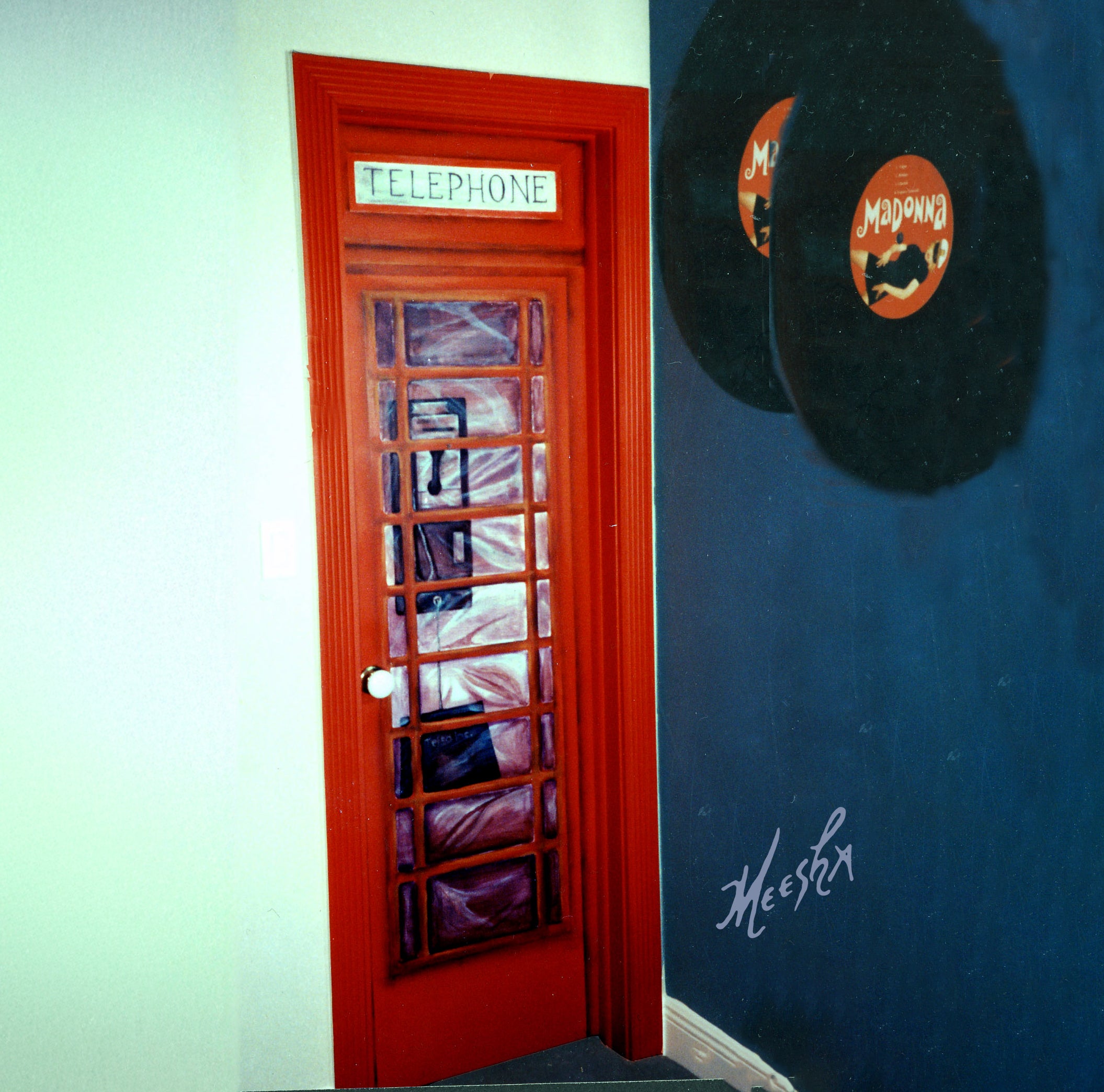British telephone booth painted on entry door in living room