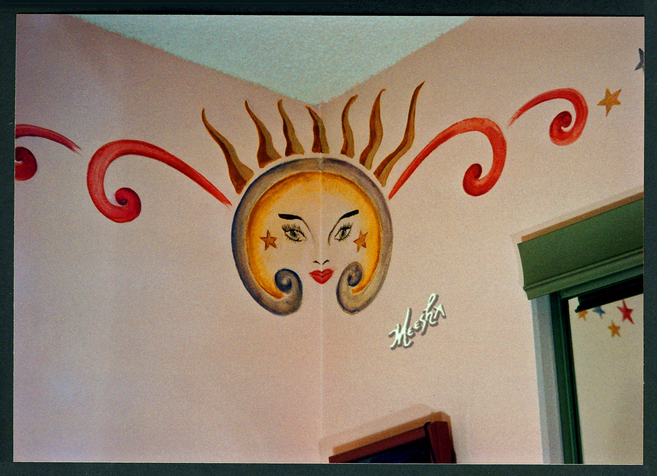 Sun-faced deco mural in children’s room