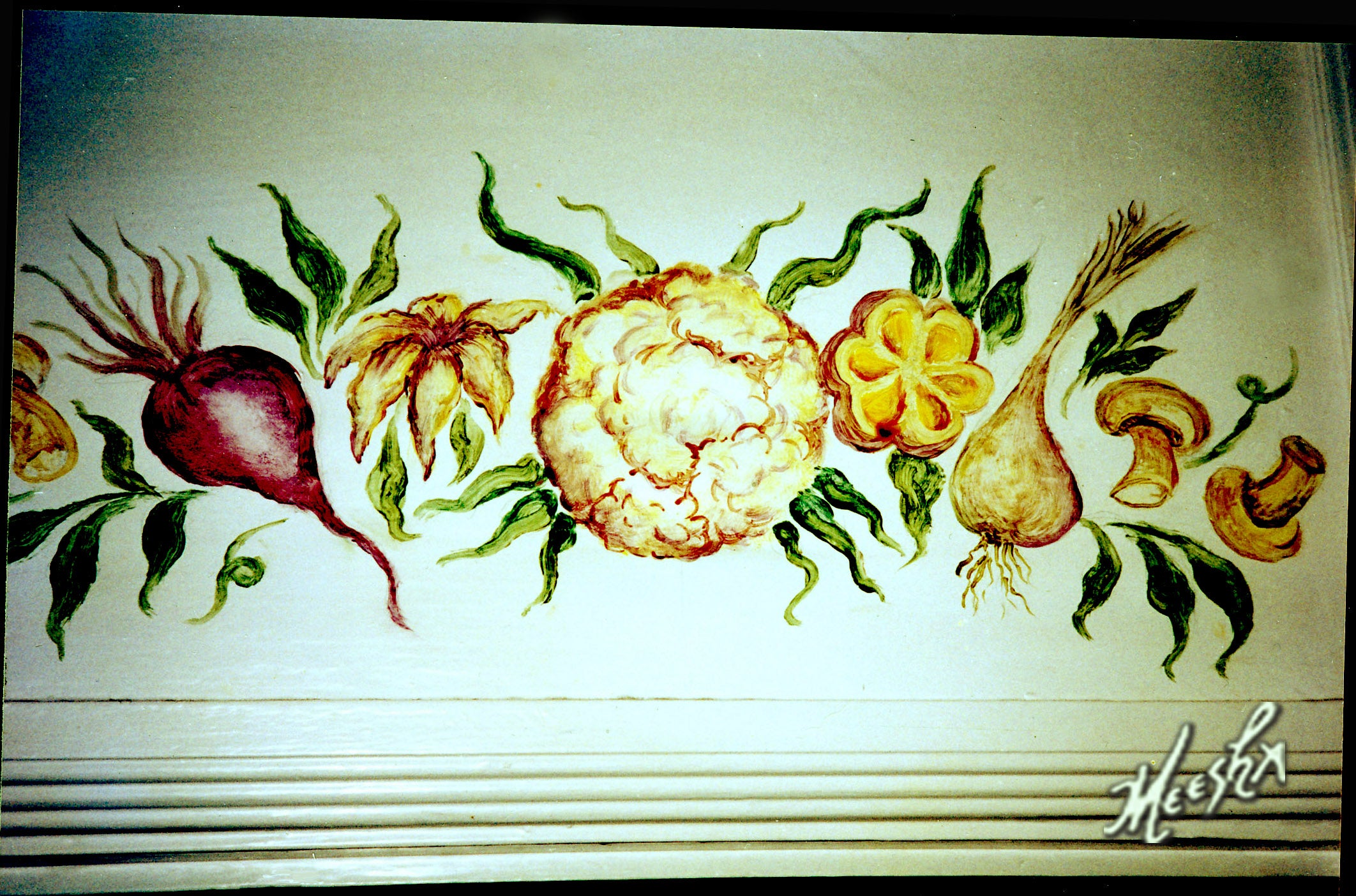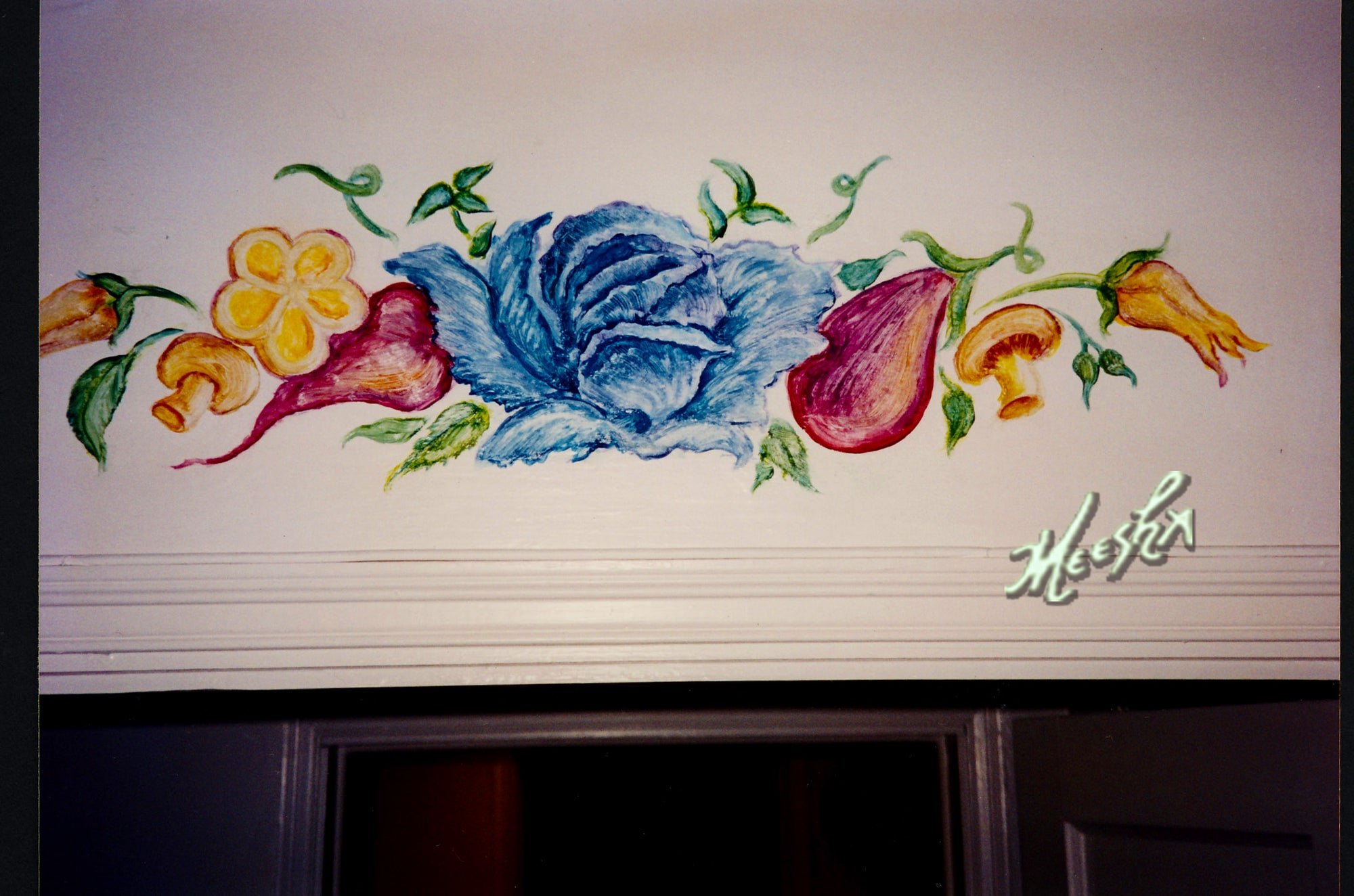 Colorful veggie mural above kitchen door #2
